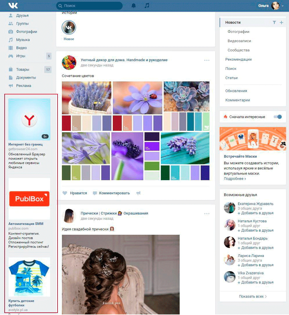 На самом деле при проведении анализов и исследований было выяснено, что среди пользователей есть много людей в возрасте от 25 лет и выше, которые используют социальную сеть как площадку для приобретения товаров и заказа услуг. В силу этого представителям разных направлений бизнеса стоит задуматься о том, чтобы использовать таргетированную рекламу. Объявления в ВК отображаются либо в новостной ленте, либо в левой части страницы. Рассмотрим особенности второго варианта.