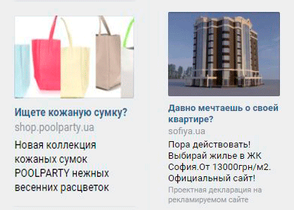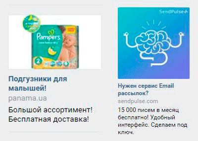 Этот продукт имеет такие технические требования: длина заголовка − до 33 символов, текстовый блок − до 70 символов, размер изображения 145х85 пикселей. Он подходит для рекламы сайтов, страниц, групп, событий и небольших приложений. Из плюсов представленного варианта отметим возможность описания товара и услуги, из минусов − маленький размер изображения.