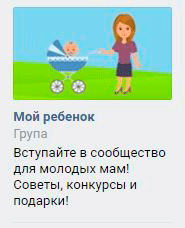 Технические требования к такому объявлению: название самого сообщества − до 33 символов, выделение жирным шрифтом. Размер картинки − 145х145 пикселей. Доступны кнопки «Вступить», «Подписаться», «Я пойду», демонстрируется информация о количестве подписчиков. Этот же формат годится для рекламы запланированных мероприятий − мастер-классов, семинаров, концертов, тренингов.