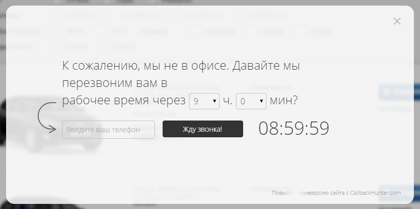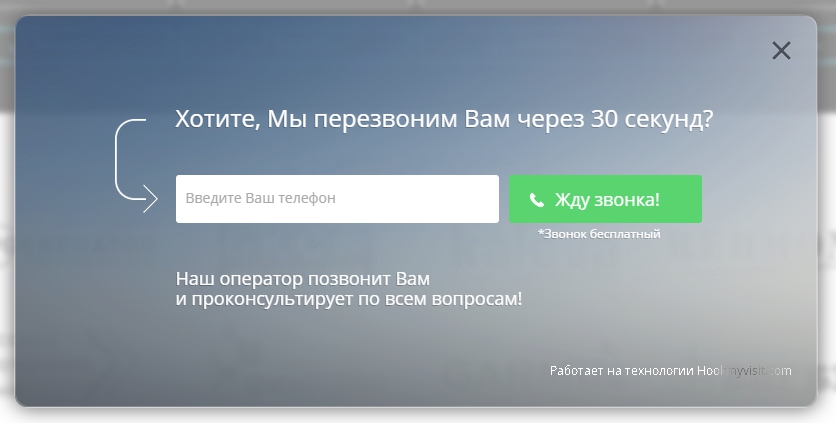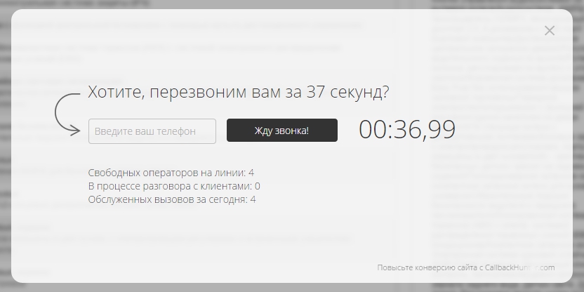 Если на него кликнуть, появляется окно, где посетителю предлагается ввести свой номер телефона, чтобы менеджер перезвонил. На все сервис дает себе 37 секунд.