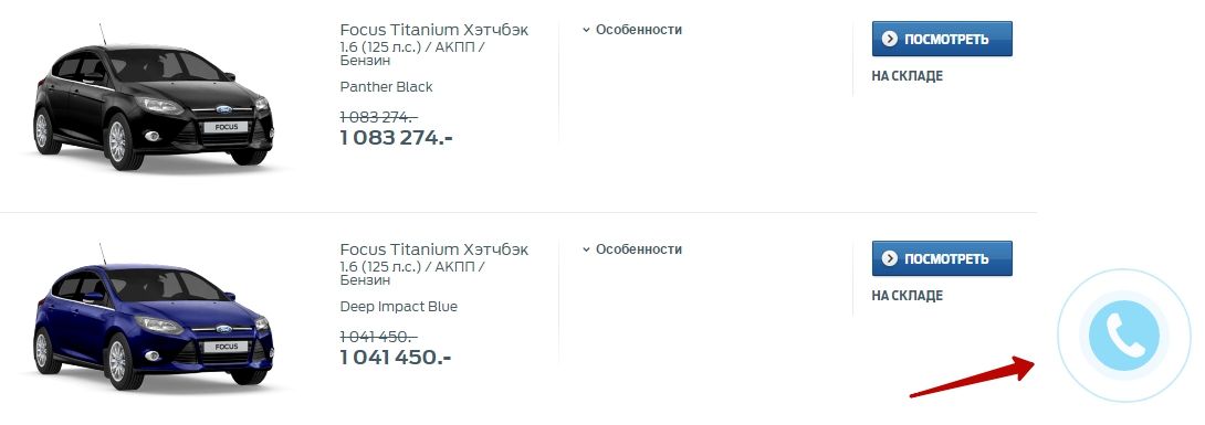 Сервис утверждает, что для эффективного функционирования не нужны изменения на сайте, не требуется дополнительная реклама и не стоит давать клиентам скидки. При определенной глубине просмотра справа возникает динамичный виджет в виде телефонной трубки. Пример с сайта ford-avilon.ru.
