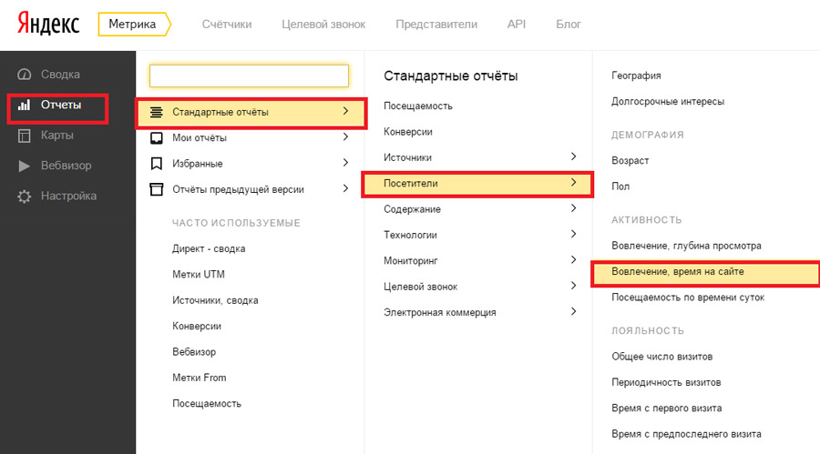 Смотреть время пребывания пользователей на сайте нужно в отчете Метрики «Стандартные отчеты» → «Посетители» → «Вовлечение, время на сайте»: