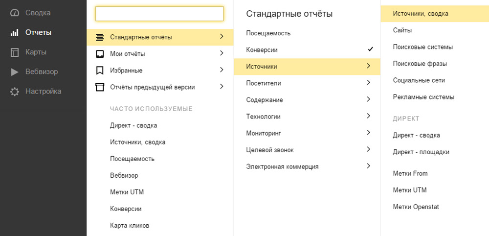 Путь до отчетов «Источники» в Метрике 2.0: