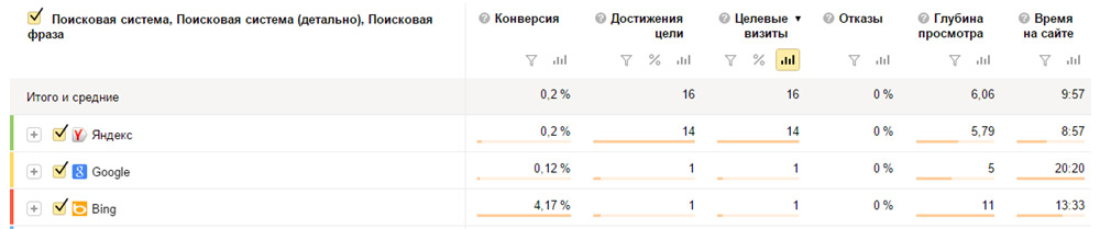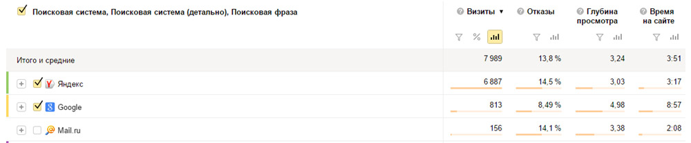 Сразу видим, что 87% трафика приносит Яндекс. Далее смотрим поведенческие факторы по поисковым системам: