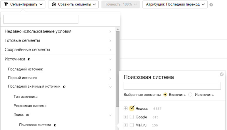 Отчет содержит поисковые фразы, по которым переходили на сайт. Для удобства можно выбрать только те запросы, по которым переходили из Яндекса. Применяем сегментацию «Источники > Последний значимый источник > Поиск > Поисковая система > Яндекс»: