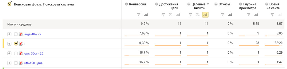После Сводки переходим в отдельные отчеты. В отчете «Поисковые системы» выясняем подробнее, какая поисковая система приносит больше всего целевого трафика и в каком поисковике стоит продвигаться. В отчете «Поисковые фразы» смотрим запросы, по которым приходят посетители на сайт.