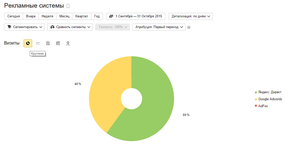 По умолчанию отчет «Источники > Рекламные системы» представлен графиком. Переключим на круговую диаграмму, чтобы понять, сколько трафика в процентах приносит каждая из используемых рекламных систем (атрибуцию лучше по «Первому переходу»):