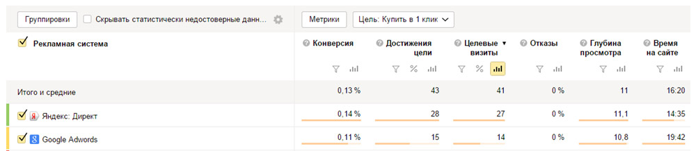 Поведенческие факторы хорошие и примерно одинаковые. Какая же рекламная система работает лучше? Снова выбираем цель «Купить в 1 клик» из выпадающего списка. Получим конверсию по рекламным системам:
