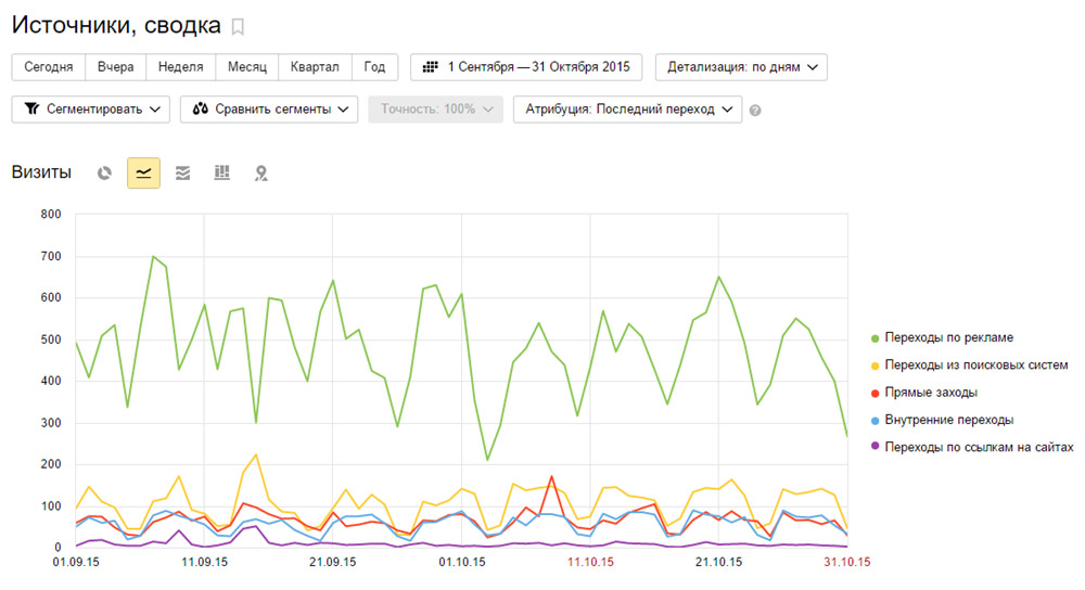 Важно: если в Сводке нет какого-либо типа источников, то он либо совсем не приносит трафика (например, не используется реклама), либо не настроен (для случая с отделением трафика с рассылок – нужны специальные метки в ссылках из писем).