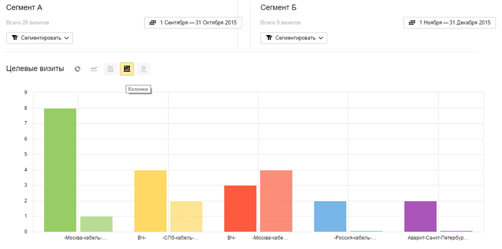 Настроим нужный период во втором сегменте и включим отображение в колонках (для наглядного сравнения):