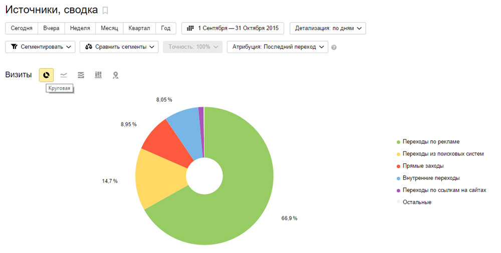 Чтобы понять, сколько процентов трафика приносит источник каждого типа, переключим отображение графика на круговую диаграмму:
