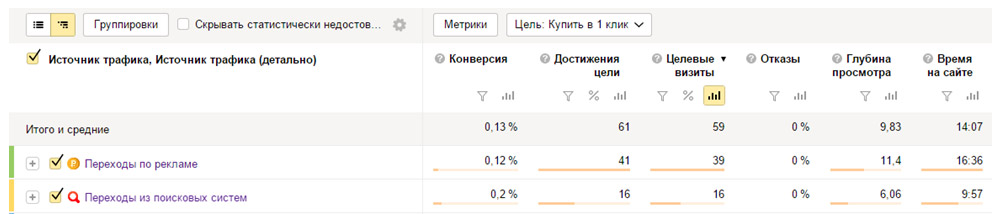 Мы знаем, что реклама приносит 67% трафика. Но насколько эффективен этот трафик? Чтобы разобраться, можно применить сегментацию по достижению цели, например, «Купить в 1 клик» (выбираем цель в выпадающем списке):