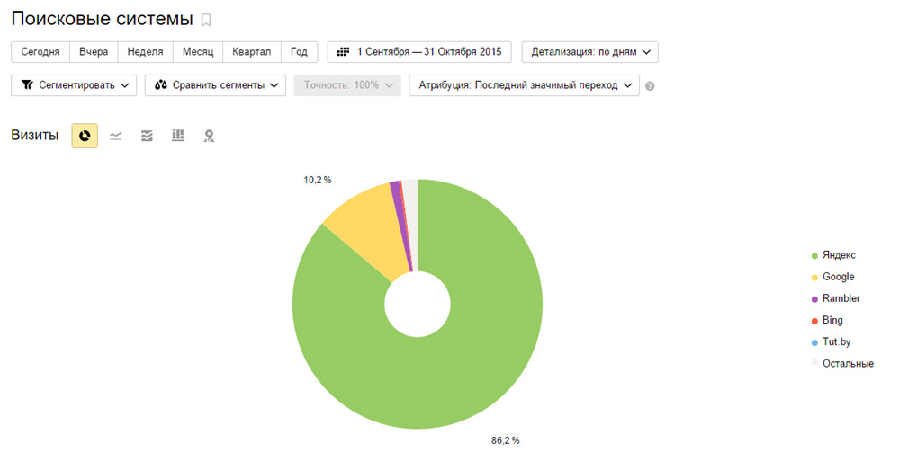 Итак, нужно узнать, какой из поисковиков приносит на сайт больше всего трафика и насколько эти посетители лояльны к сайту. По умолчанию отчет «Источники > Поисковые системы» выглядит так: