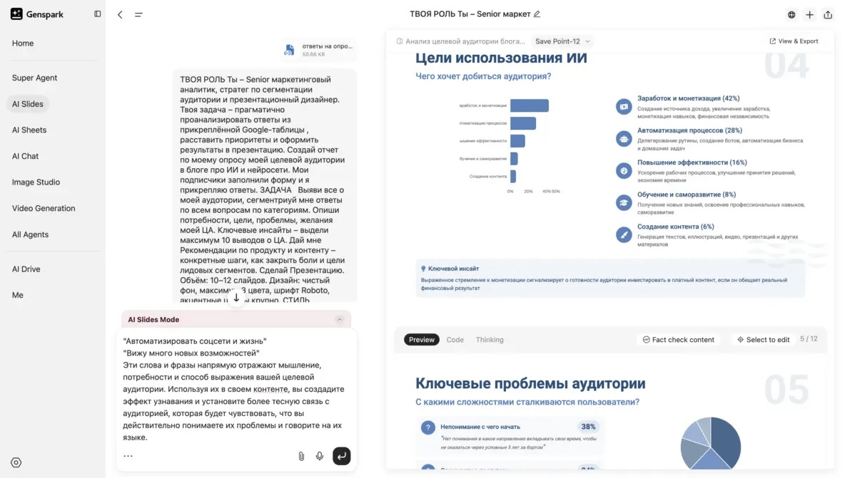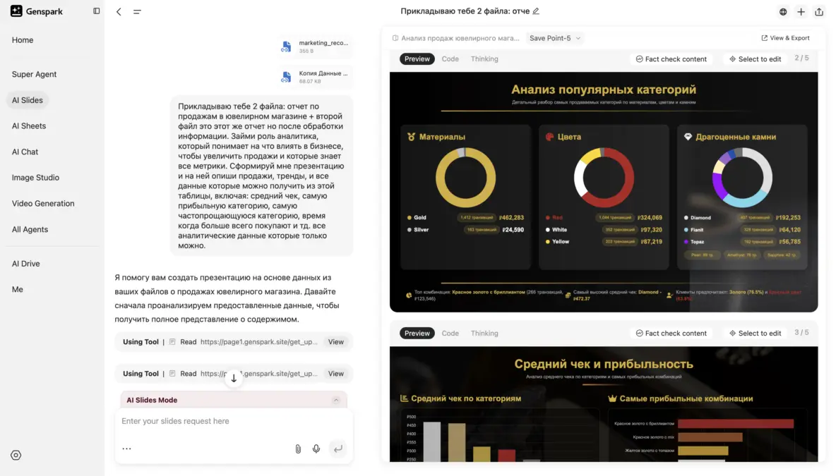 Этот сервис Genspark идеально работает с презентациями, идеально работает с таблицами. С таблицами вообще никто так не умеет работать — ни один искусственный интеллект. Да и с презентациями я не видел подобного уровня ранее.